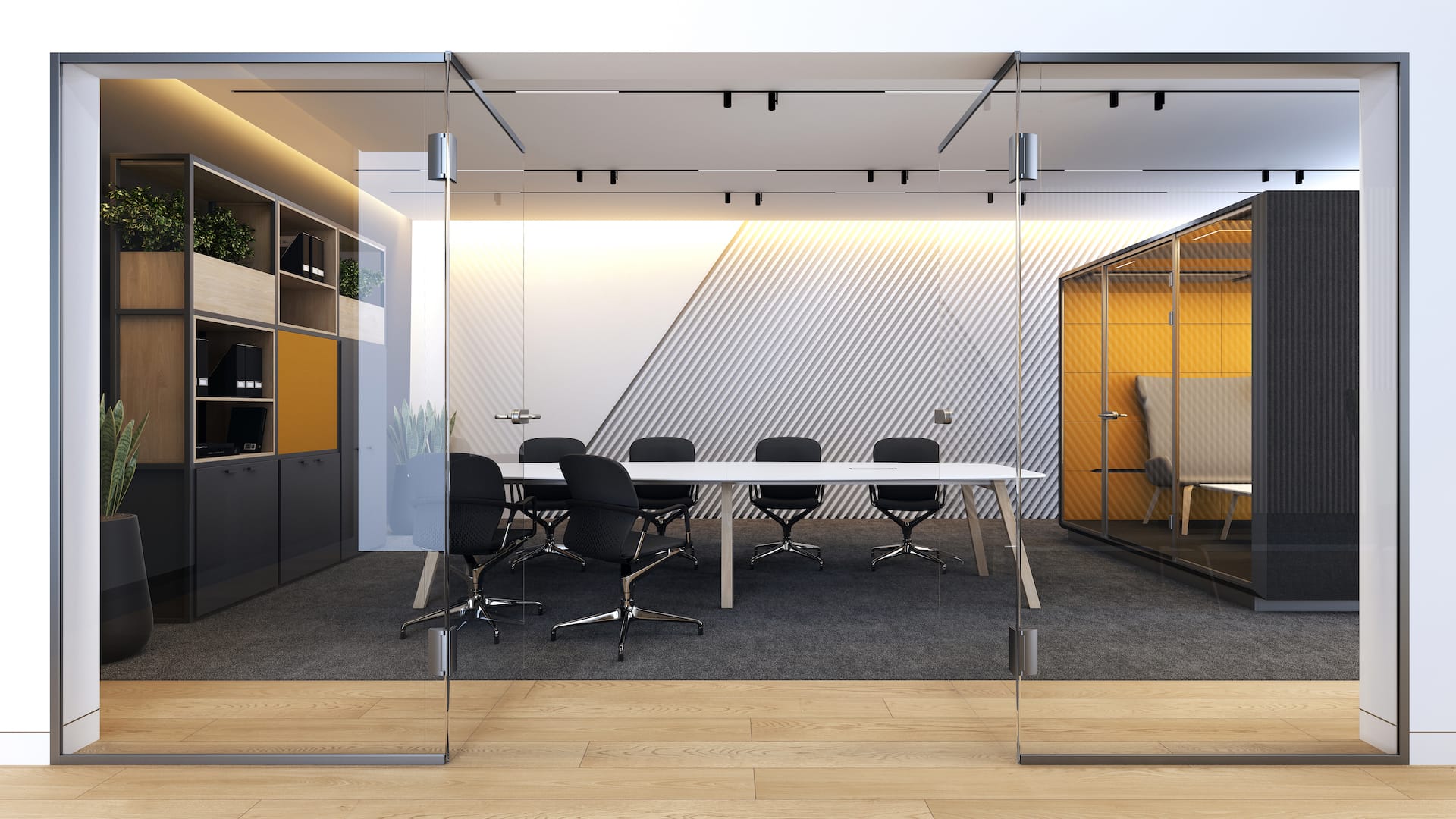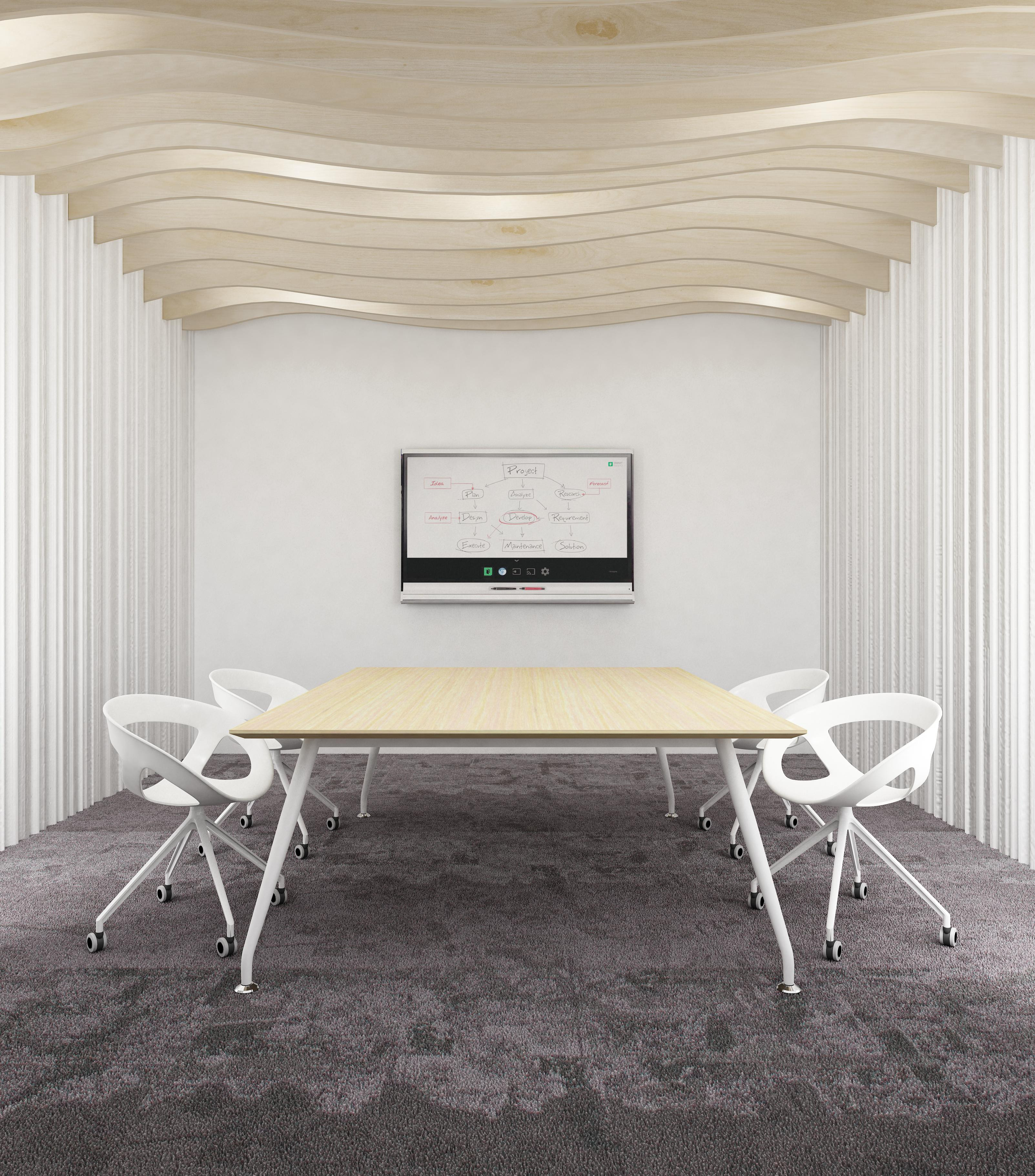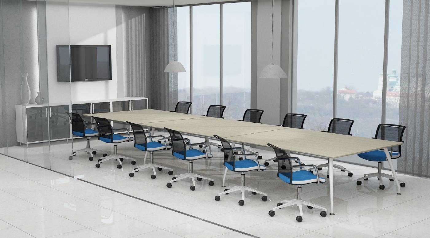 Nietypowy kształt blatu stołów konferencyjnych nadaje konstrukcji lekkości i wpływa na interakcję użytkowników. Minimalizacja ilości nóg pozwala na maksymalne wykorzystanie powierzchni stołu.